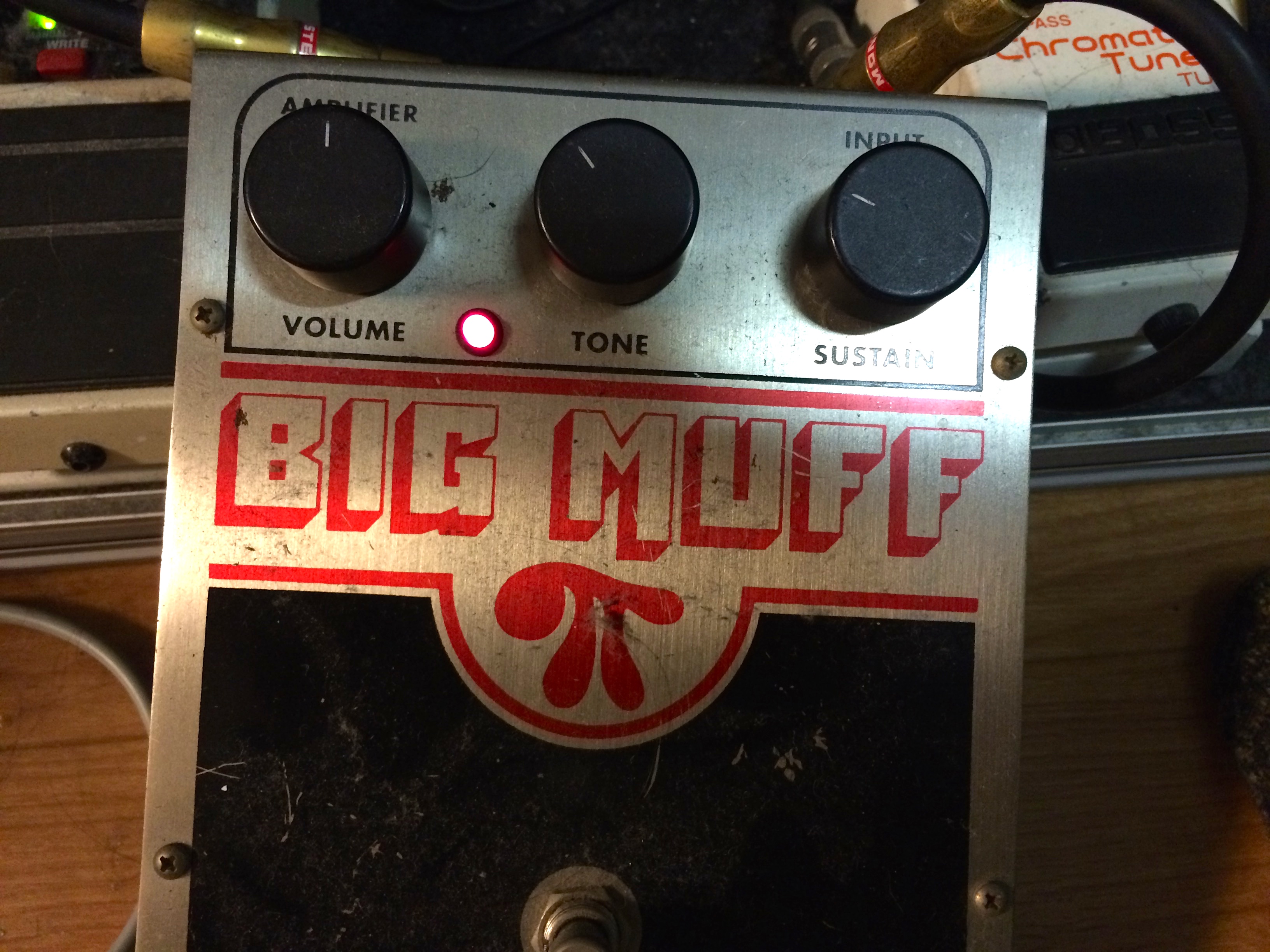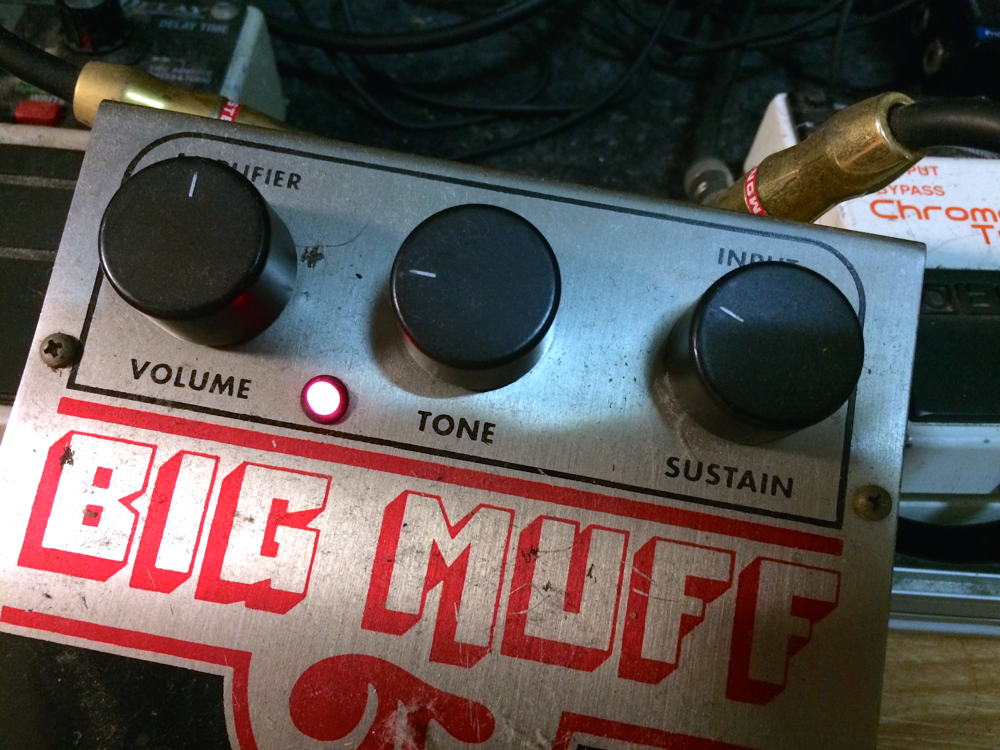 The next take was a little difficult. I needed to find the right setting to blend with the low-end guitar sound I recorded prior to. Left the Volume and Sustain knob alone, but raised the Tone knob to 11o’clock. Doesn’t look like alot of change… but if you’ve used a Big Muff before, I’m sure you can understand how much tonal difference that makes 🙂 Recorded two layers with each guitars with the same settings.